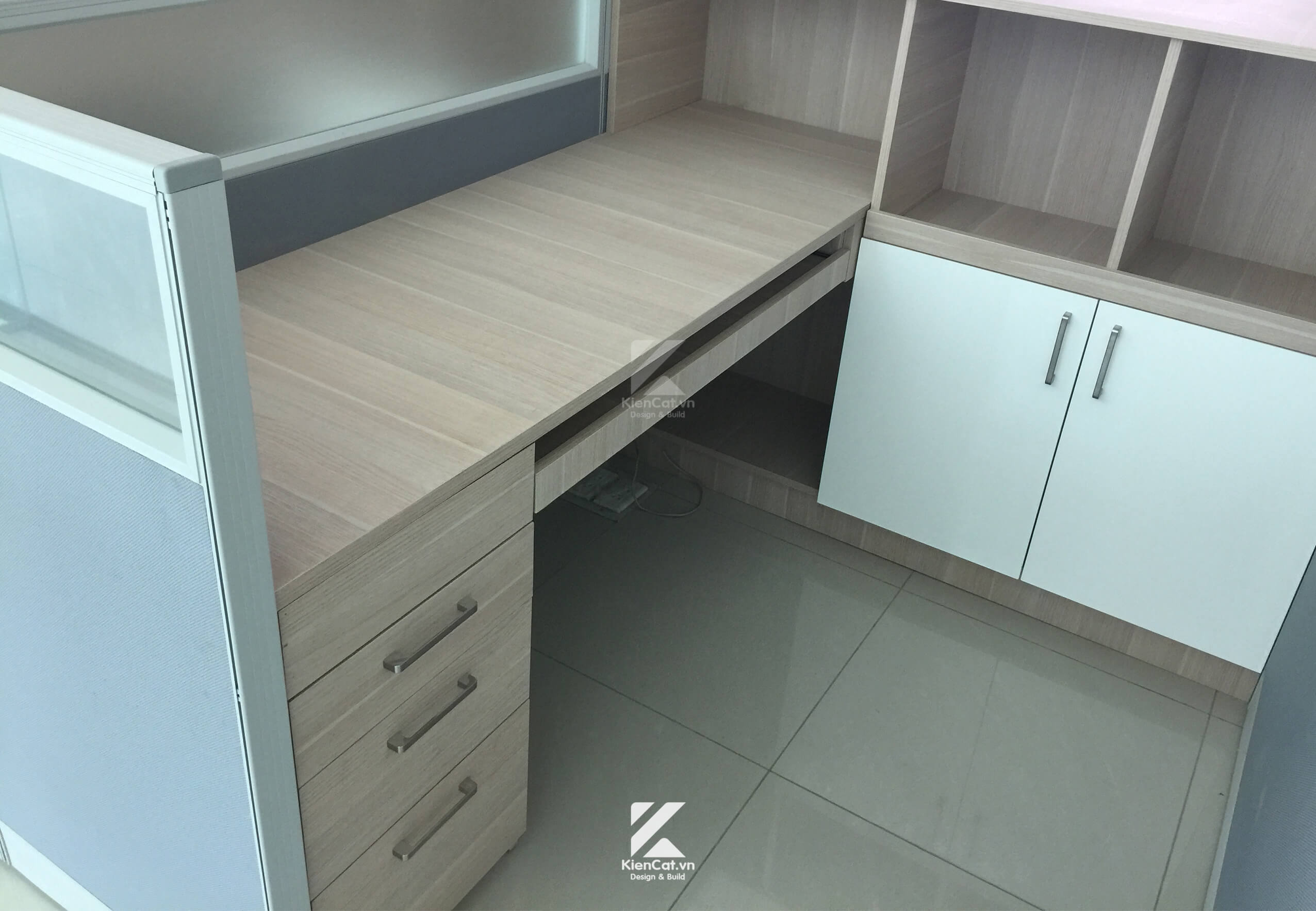 Khu vực nhân viên được thiết kế dạng module với vách ngăn kính mờ khung nhôm định hình. Cách bố trí này vừa đảm bảo sự riêng tư cần thiết, vừa duy trì tính kết nối trong đội ngũ. Mỗi vị trí đều tích hợp hộc tủ cá nhân với ray trượt êm ái.