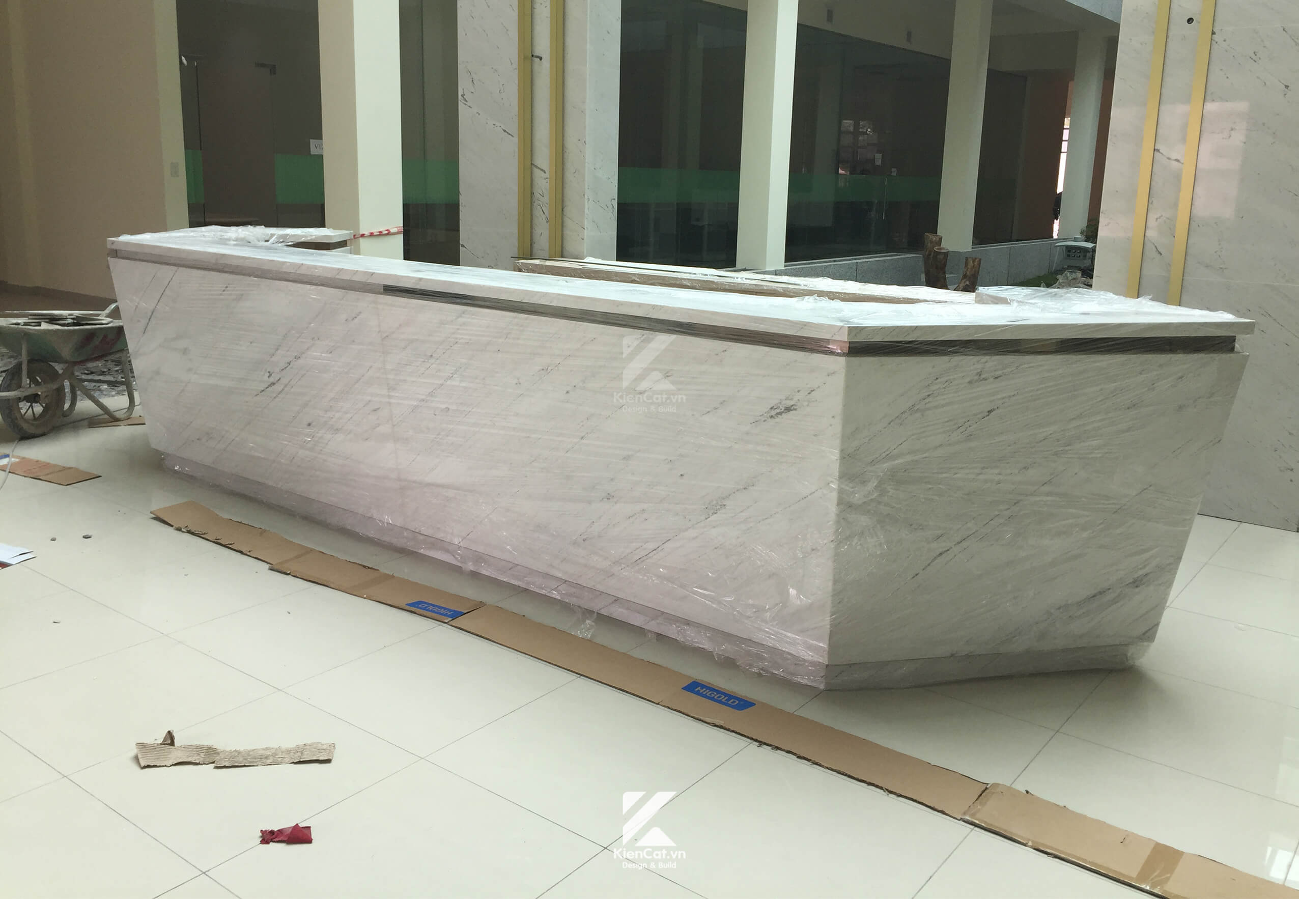 Là bộ mặt tiếp xúc trước tiên với khách hàng, nên quầy lễ tân được chúng tôi thiết kế hiện đại với hình khối mạnh mẽ. Chất liệu đá toàn khối sang trọng và đẳng cấp.