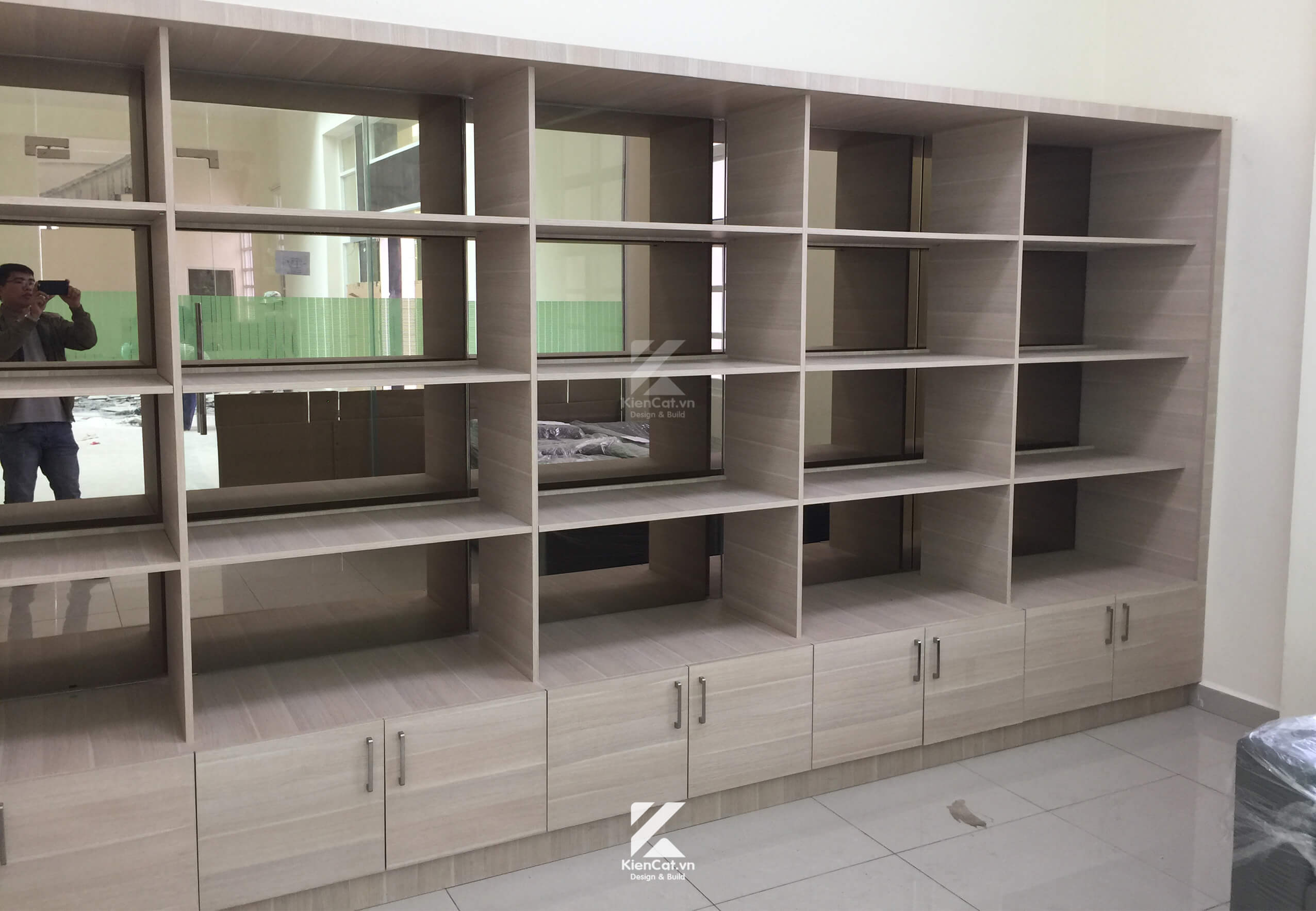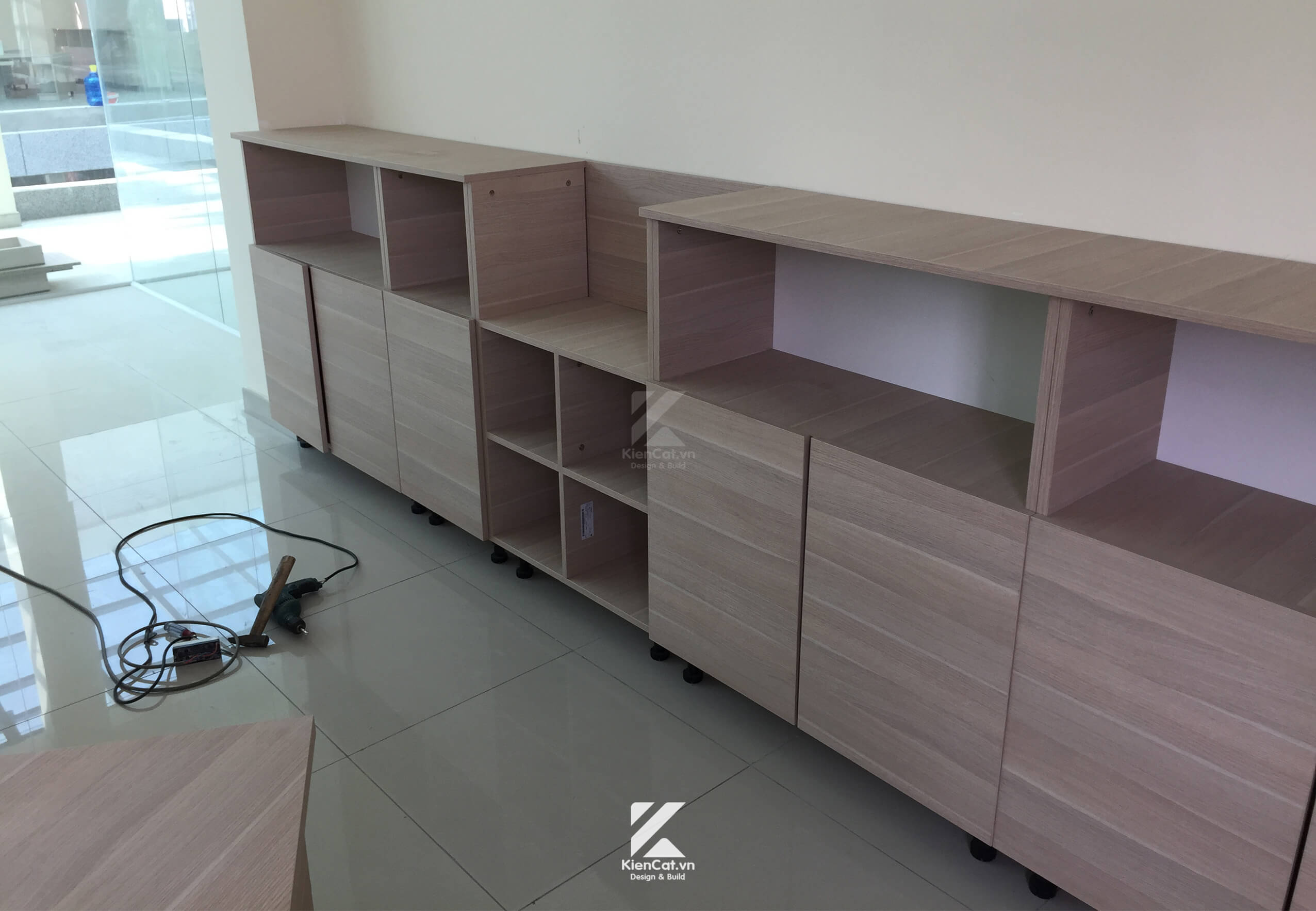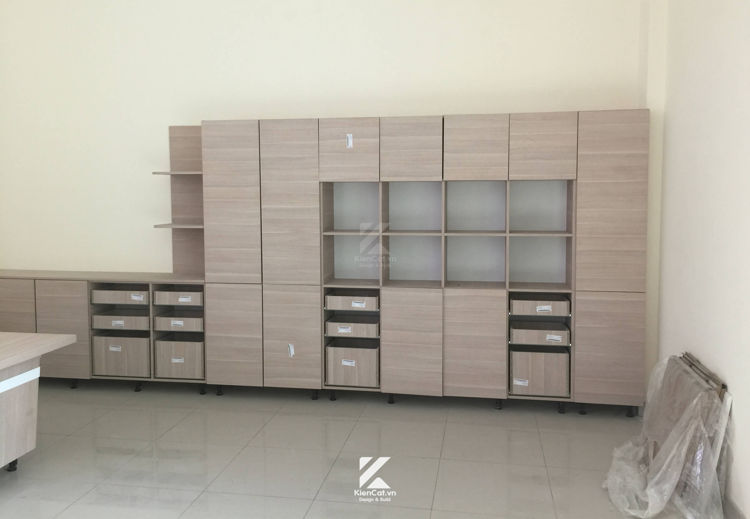 Đối với một công ty sản xuất, việc lưu trữ hồ sơ là cực kỳ quan trọng. Kiến Cát đã thiết kế hệ tủ cao kịch trần và các dãy tủ thấp chạy dọc theo tường. Sự kết hợp giữa cánh kín và các ngăn kệ hở (open shelving) giúp không gian không bị bí bách mà vẫn đảm bảo sức chứa khổng lồ.
