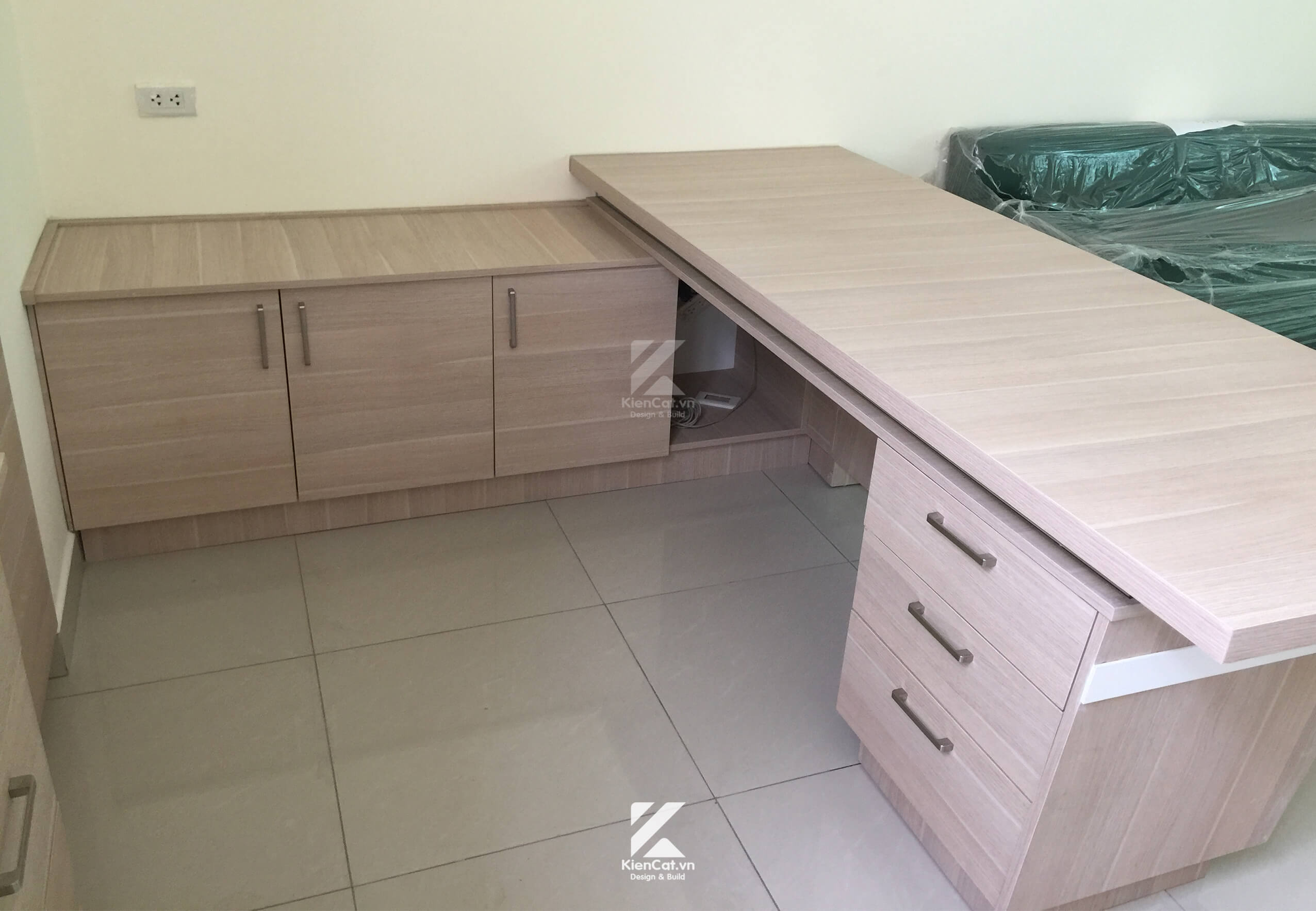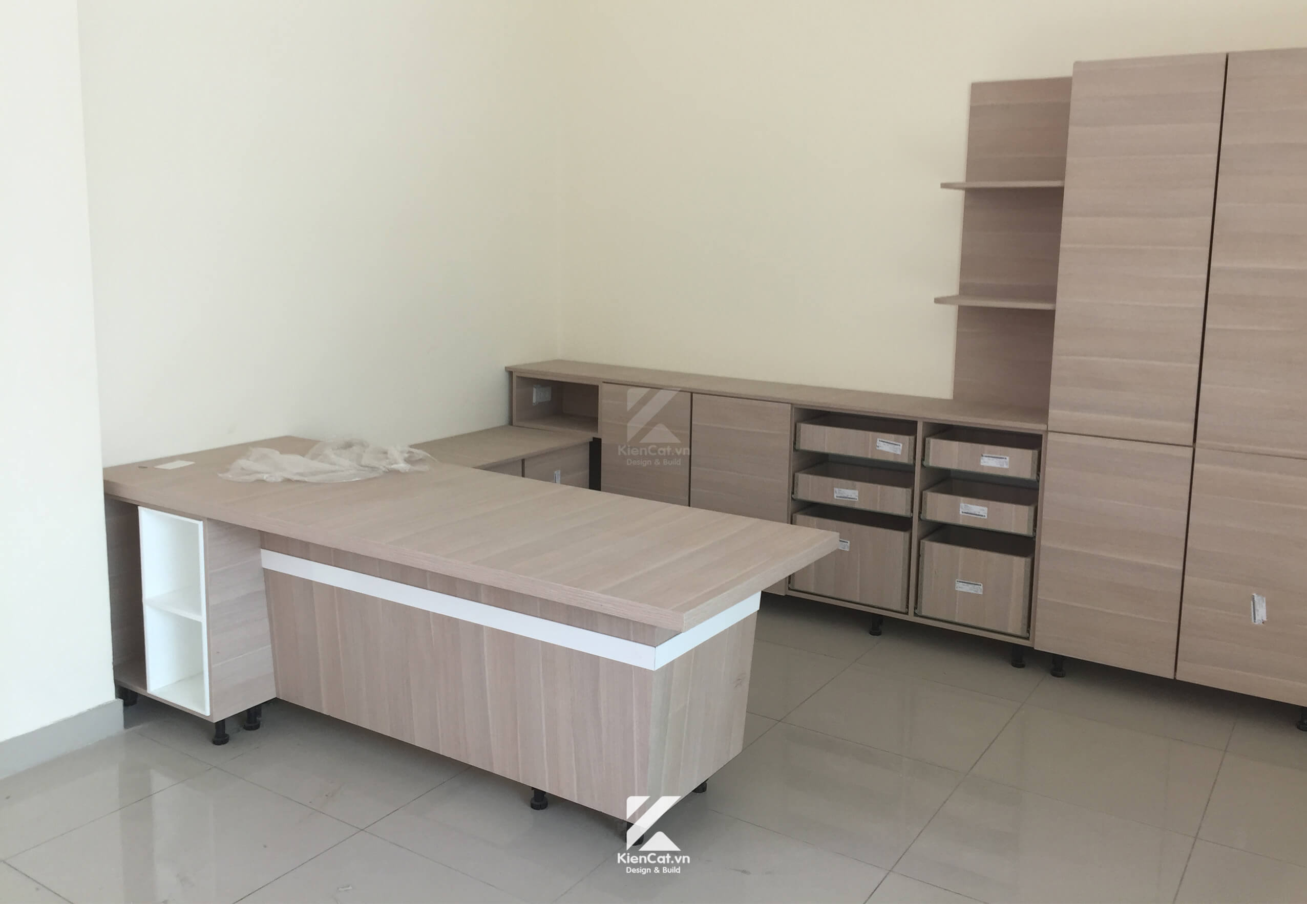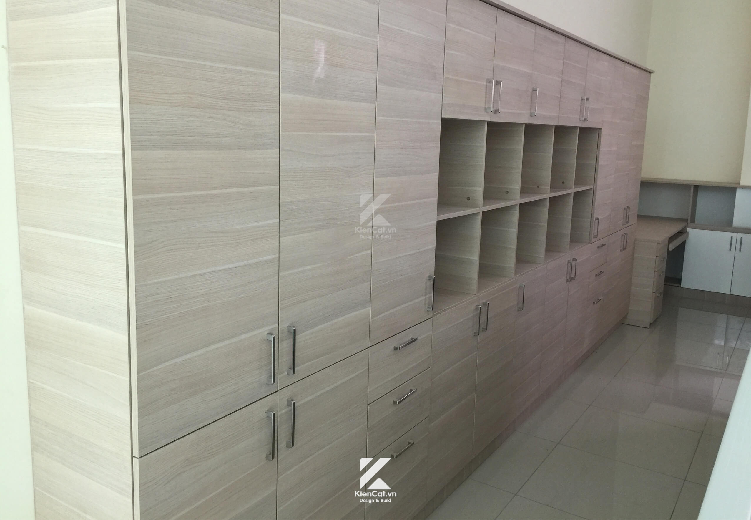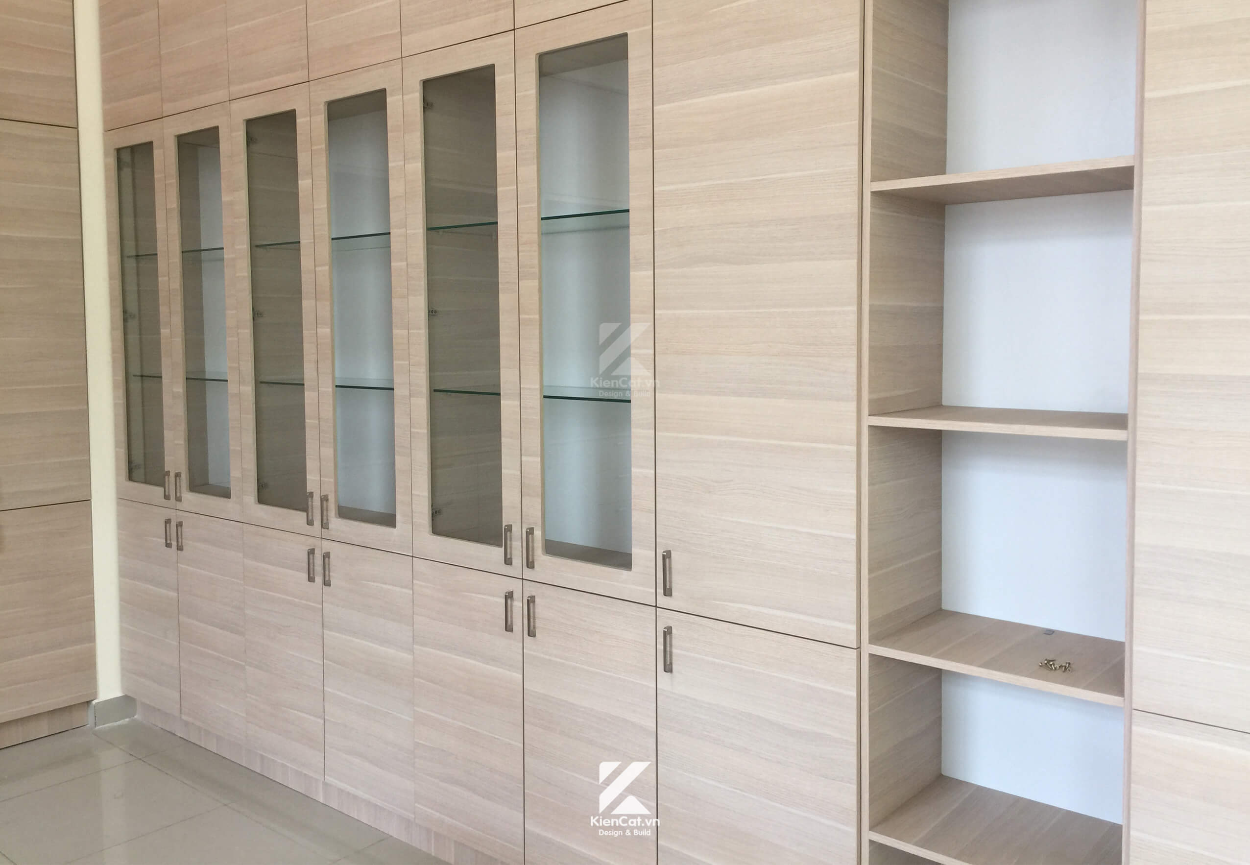 Đối với một công ty sản xuất, việc lưu trữ hồ sơ là cực kỳ quan trọng. Kiến Cát đã thiết kế hệ tủ cao kịch trần và các dãy tủ thấp chạy dọc theo tường. Sự kết hợp giữa cánh kín và các ngăn kệ hở (open shelving) giúp không gian không bị bí bách mà vẫn đảm bảo sức chứa khổng lồ.
