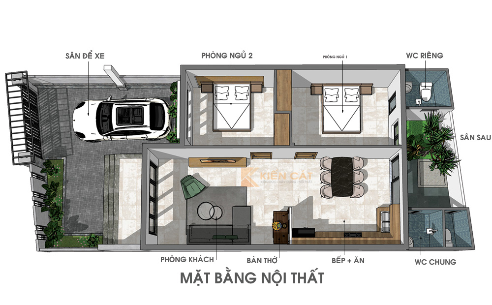 Cây xanh được bố trí khéo léo ở khu vực mặt tiền, hàng rào và sân trước, tạo nên lớp đệm tự nhiên giúp giảm nắng, bụi và tiếng ồn. Không gian xanh góp phần làm mềm kiến trúc, mang lại cảm giác thư thái – yếu tố rất quan trọng trong các mẫu nhà cấp 4 hiện đại.