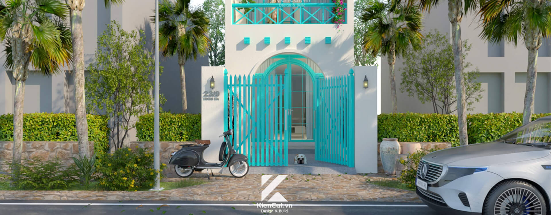 Công trình nhà phố phong cách santorini mang đậm phong cách Địa Trung Hải, gợi nhớ rõ nét tinh thần Santorini, nhưng được tiết chế để phù hợp với nhà phố Việt Nam. Đây là một kiểu thiết kế lãng mạn, tươi sáng, với màu xanh ngọc đặc trưng rõ nét và nổi bật, chi tiết trang trí mang lại cảm giác mát mẻ, gợi liên tưởng đến biển và bầu trời – đặc trưng rất rõ của kiến trúc Santorini. Sự phối màu này không cầu kỳ nhưng tạo hiệu ứng thị giác mạnh, khiến ngôi nhà nổi bật giữa dãy phố.